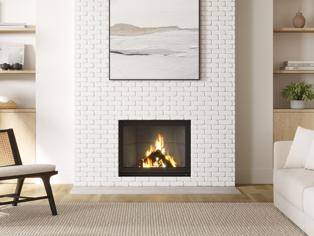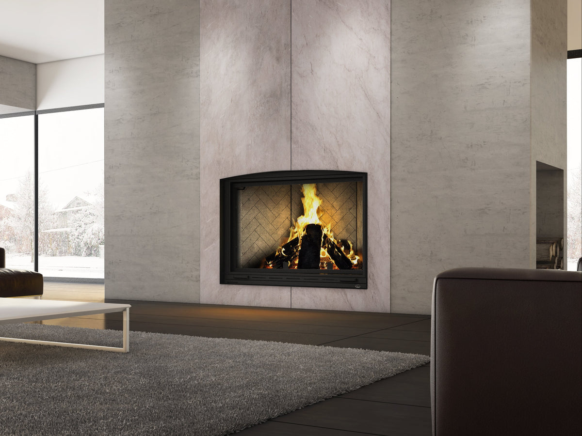 The LUXUS® 36 Pier is a premium 3-sided “pier” wood fireplace that gives you flame views from nearly anywhere in the room, with a smooth guillotine door that lifts and disappears behind your finish. Built with German engineering and chamotte refractory panels that store and radiate heat, it delivers up to 57,500 BTU for impressive fires and real warmth.