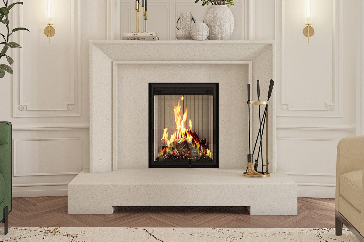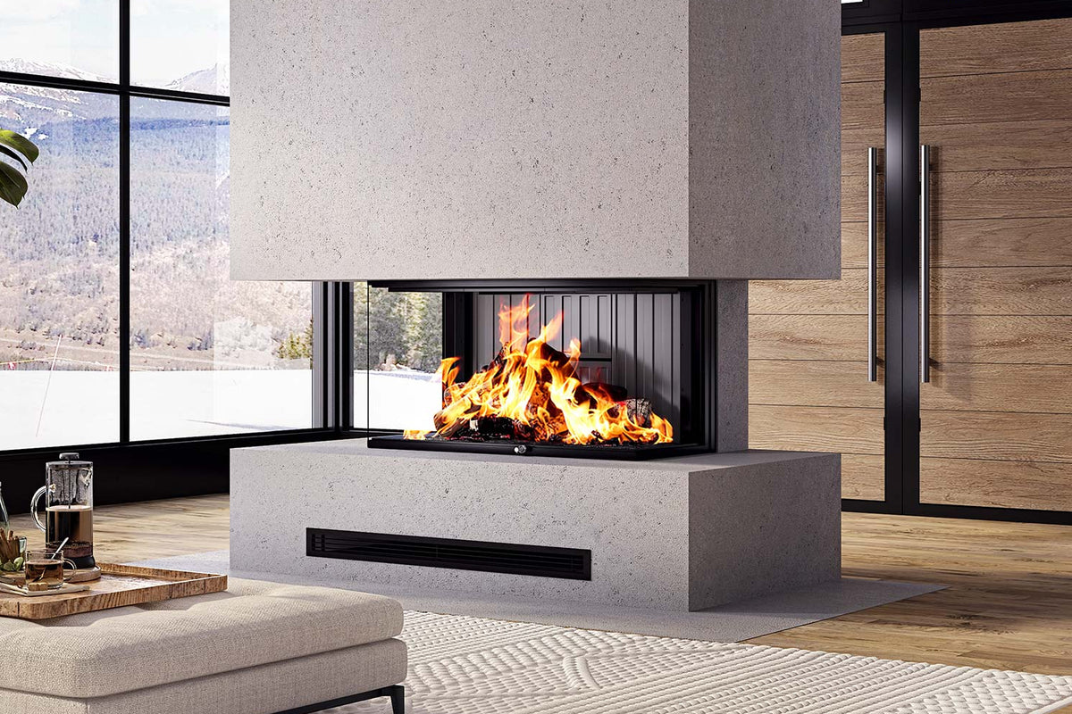 The LUXUS® 32 Bay is a German-engineered, 3-sided bay wood fireplace that delivers a huge flame view and a premium finish. Its smooth guillotine glass door lifts effortlessly and disappears behind your facing, while chamotte refractory panels absorb heat and radiate warmth back into the room.