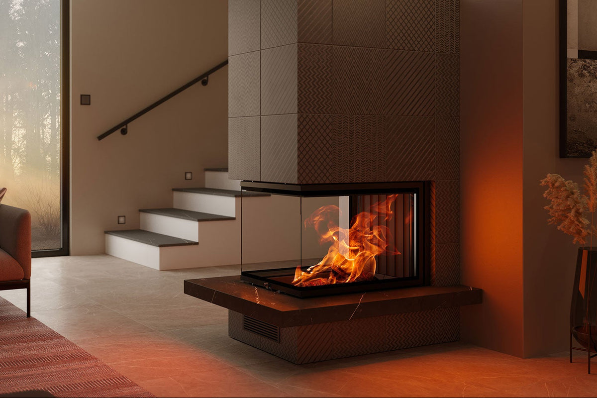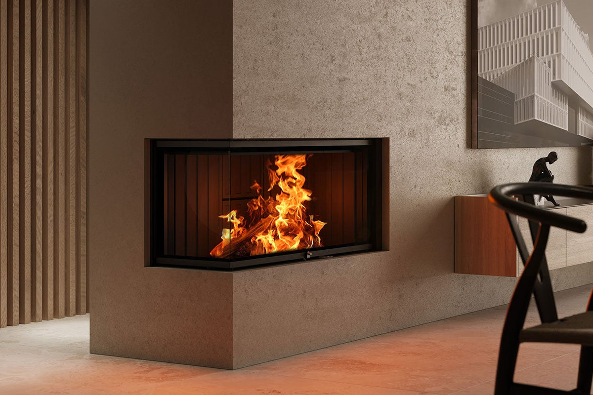 The LUXUS® 32 Corner Left/Right is a premium 2-sided corner wood fireplace with a smooth guillotine glass door that lifts and disappears behind your finish for a clean, high-end look. With up to 46,000 BTU and chamotte refractory panels that hold and radiate heat, it’s built for serious ambiance and real warmth.