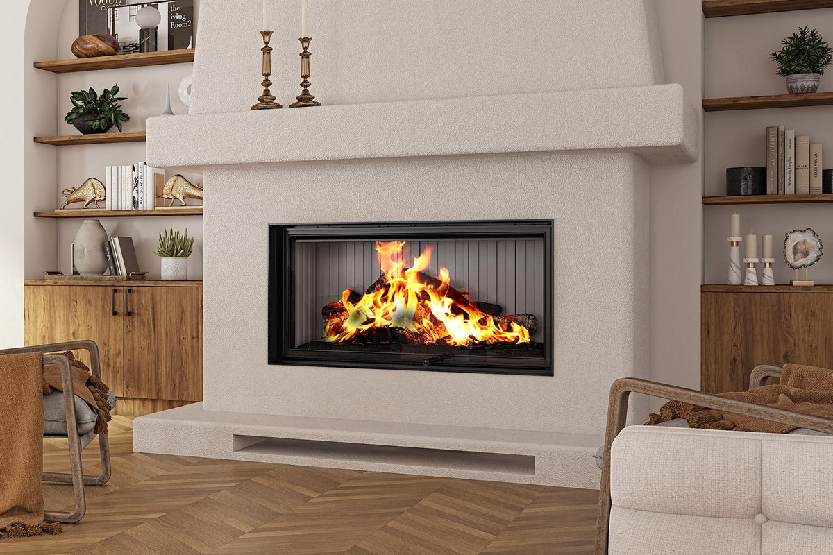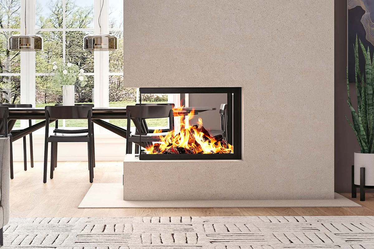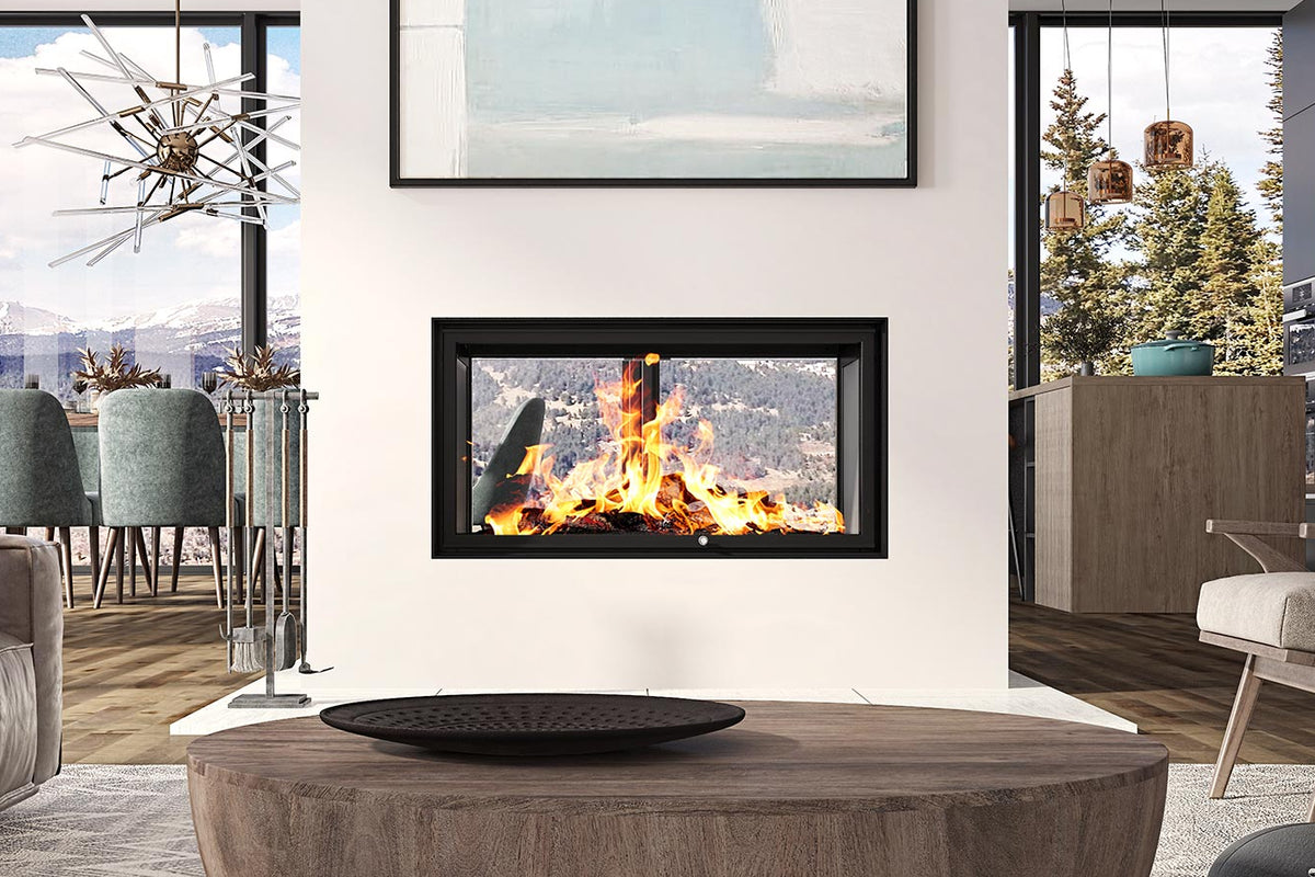 The LUXUS® 40 See-Thru is a premium see-through wood fireplace that lets you enjoy the fire from two rooms at once. It features an ultra-smooth guillotine glass door that disappears behind your finish, plus chamotte refractory panels that store heat and radiate it back for better comfort.