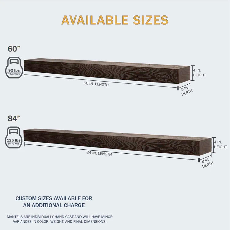 The non-combustible mantel is finished in three standard colors: Walnut, Mahogany, and Honey Oak, which tastefully accentuate the subtle expressions of the grain. Crafted using our proprietary concrete casting formulation, allows for closer placement to heat sources, making it an excellent choice for safely mounting a TV above the fireplace.