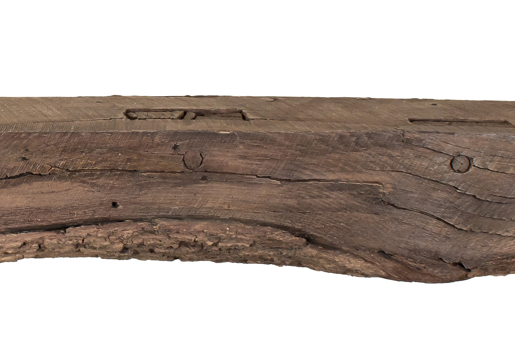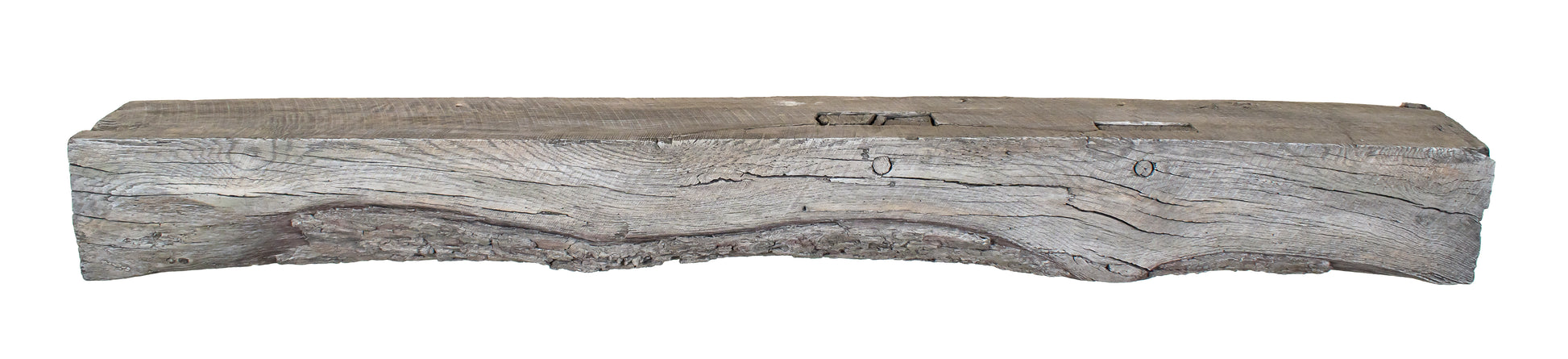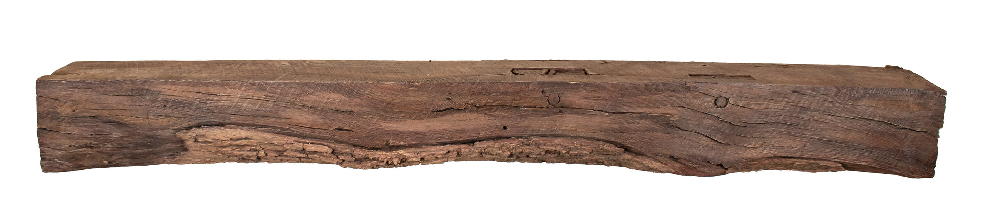 The Rickhouse Rustic Mantel is inspired by the bourbon aging warehouses on Kentucky’s Bourbon Trail. This beam mantel is molded directly from a 7.5” x 7.5” old-growth timber to authentically reproduce its natural features, including a sliver of live-edge bark, mortise & tenon joinery, deep checking, knots, saw marks, tooling marks, and beautiful wood grain & end grains.