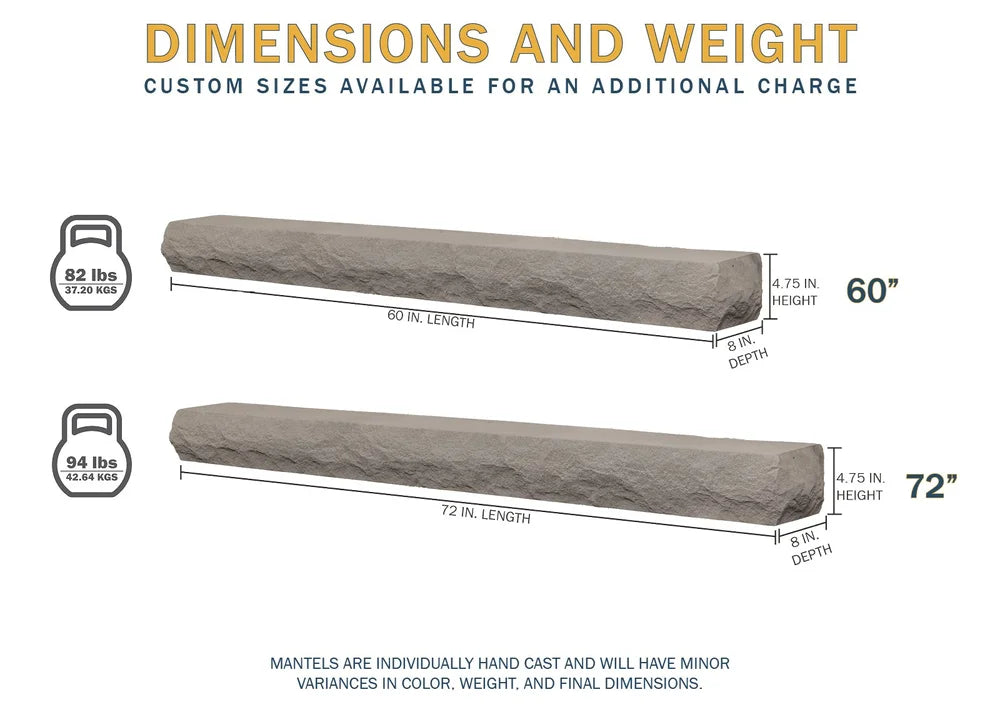 This stone mantel shelf has a cross-section measuring 8” deep by 4.75” high, providing ample space to display your heirlooms, trophies, and family photos.