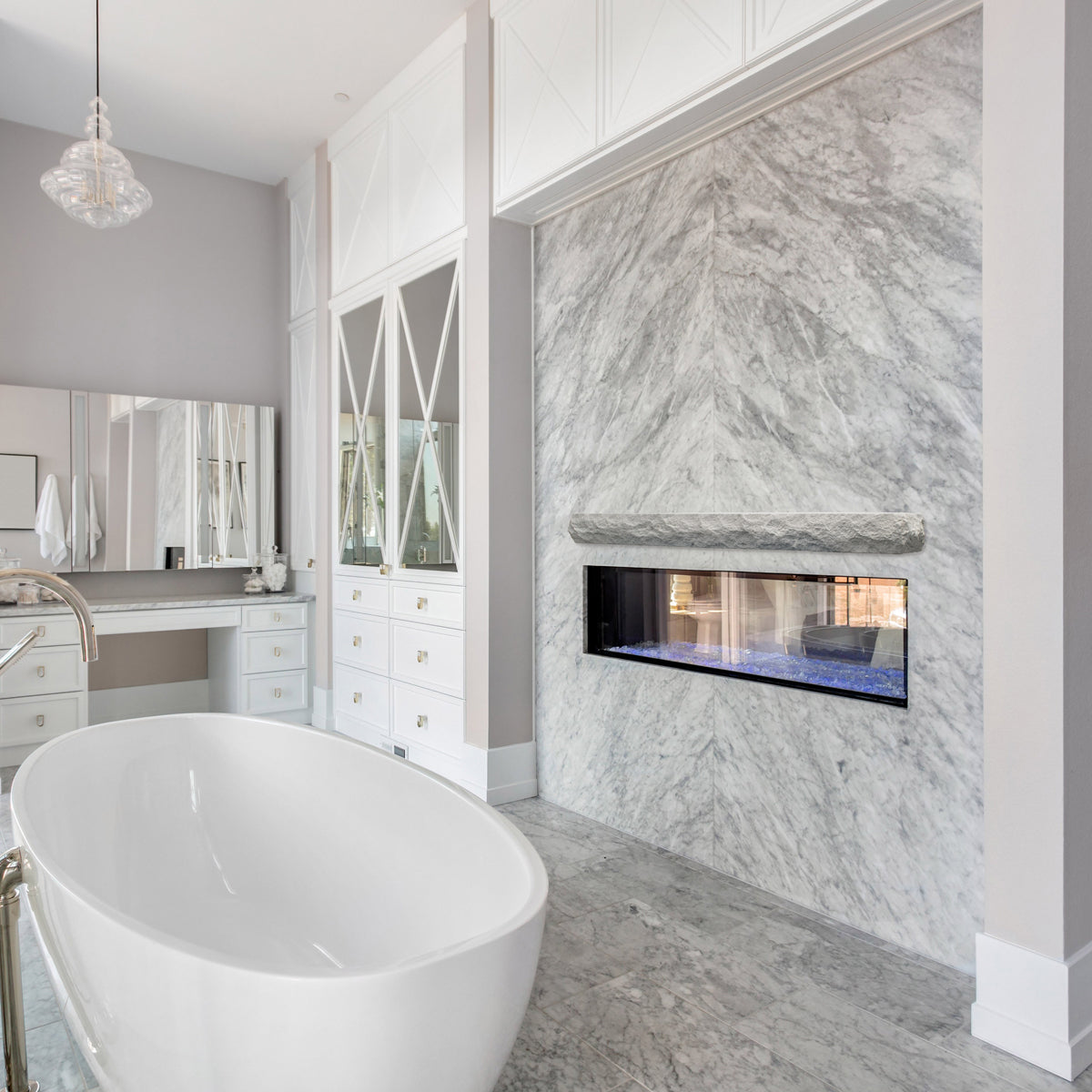 Our Rockface Stone Mantel is molded from locally quarried stone and honors the steep limestone palisades lining our Kentucky River.