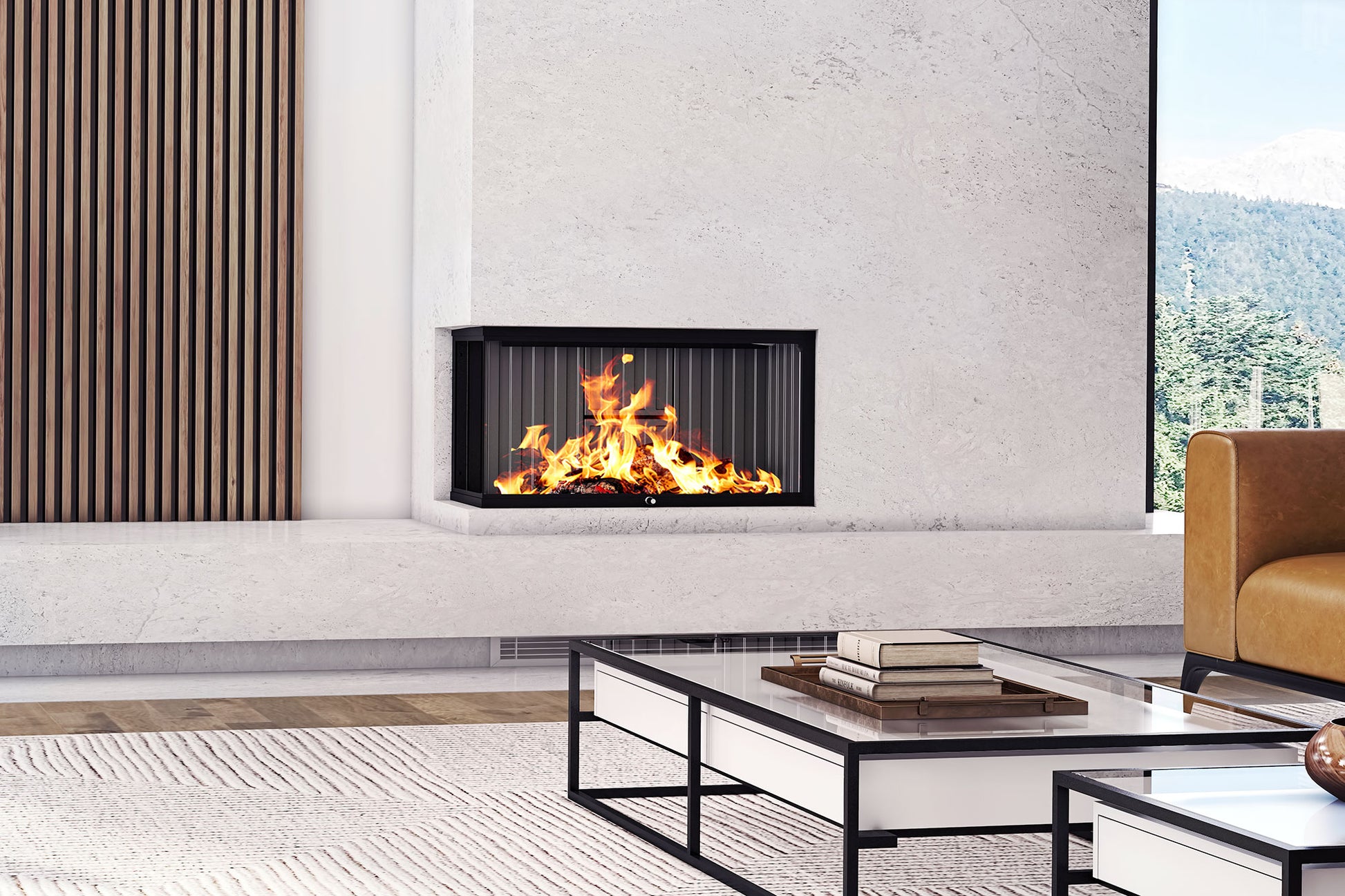 The LUXUS® 32 Corner Left/Right is a premium 2-sided corner wood fireplace with a smooth guillotine glass door that lifts and disappears behind your finish for a clean, high-end look. With up to 46,000 BTU and chamotte refractory panels that hold and radiate heat, it’s built for serious ambiance and real warmth.