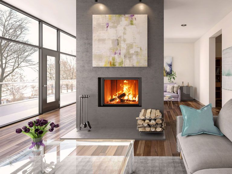 The built-in guillotine door and screen glide smoothly on vertical rails using bearings and duo counterweights. The same fluid motion is used in a tilt-forward system for easy cleaning and servicing. Both the guillotine and tilt-forward systems simplify loading, operation, and maintenance while providing safety to those wanting the experience of a 600 in2 view of a beautiful, open, crackling fire.